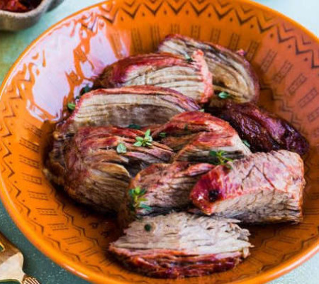 - Coloque a maminha numa travessa, temperada com manteiga, sal e pimenta.