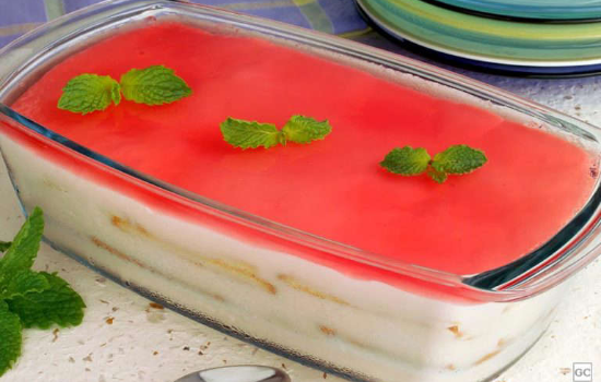 - Despeje a gelatina reservada sobre o creme firme e leve à geladeira por 6 horas ou até firmar.