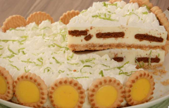 - Desenforme e coloque os biscoitos de tortinhas ao redor de toda a torta, uma ao lado da outra, decorando.