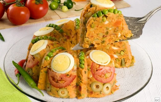 - Em uma fôrma de buraco no meio média, faça uma decoração colocando nas laterais e no fundo rodelas de tomate, de ovo cozido, azeitona e ervilha.