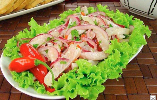 - Decore uma travessa com folhas de alface e disponha o ceviche por cima.