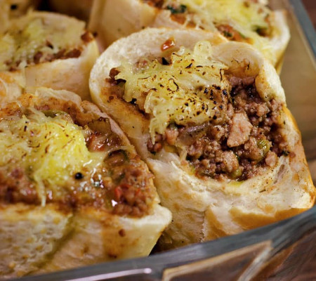 - Corte os pães ao meio, retire o miolo e divida a carne entre eles.