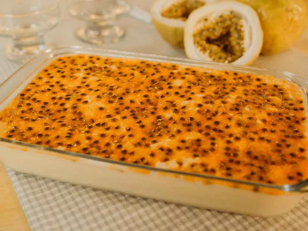 4 Coloque em um refratário e decore com sementes de maracujá.
