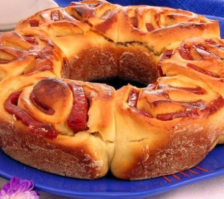 - Espalhe a goiabada, enrole como rocambole e corte em fatias grossas. - Arrume uma ao lado da outra, coloque em 2 fôrmas de buraco no meio de 26cm de diâmetro untadas e enfarinhadas e pincele a gema.