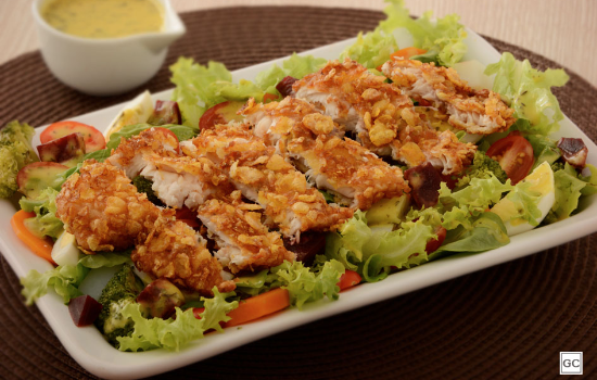 Receita de peixe empanado crocante com salada para qualquer ocasião