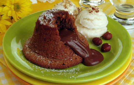 - Distribua em 6 forminhas individuais untadas e enfarinhadas, coloque em uma fôrma grande e leve ao forno médio, preaquecido, por 10 minutos.