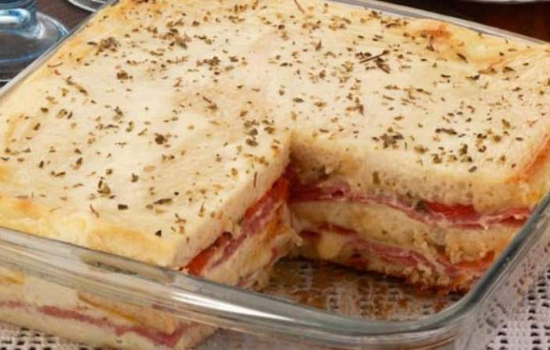 - Faça camadas de pão, creme, presunto, mussarela e tomate temperado com sal e orégano.