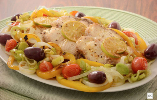 - Regue com azeite, tempere com sal e, sobre elas, coloque o peixe temperado.