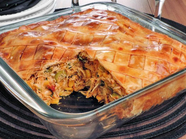 - Forre um refratário médio untado com parte da massa de pastel e espalhe o recheio por cima.