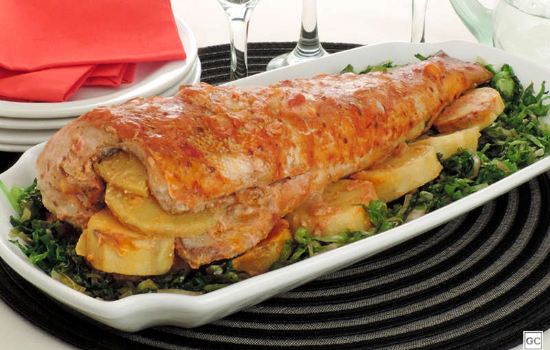 - Em uma fôrma untada, faça uma camada de batata-doce e disponha o peixe temperado com o suco, o alho, sal e pimenta por cima.