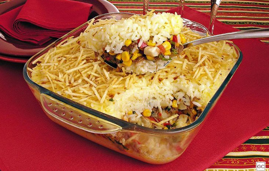 - Em um refratário untado, faça uma camada com metade do arroz, uma com o refogado e outra com o restante do arroz.