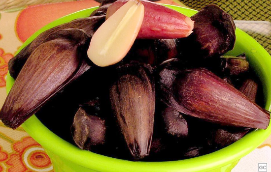 - Lave o pinhão e com uma faca de serra corte a ponta mais fina e coloque em uma panela de pressão.