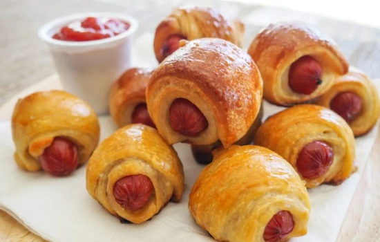 - Coloque uma salsicha no centro de cada triângulo e enrole.