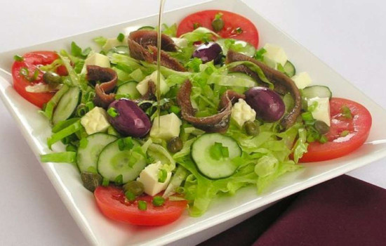 - Acrescente as azeitonas pretas, os filés de anchovas picados, a cebolinha picada, as alcaparras e o queijo por cima.