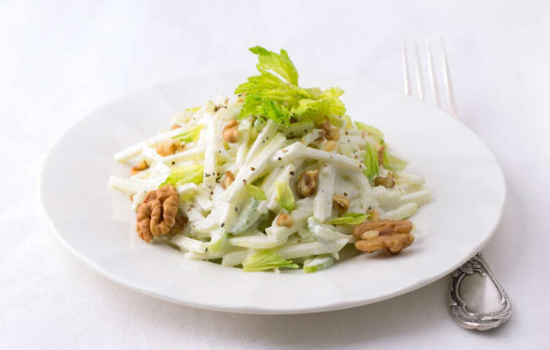 Passo 4: Cubra as nozes com a mistura de maçã e aipo-rábano e acrescente o molho. Tempere a salada com sal e pimenta a gosto e disponha em 4 pratos fundos. Decore os pratos com o restante das nozes e as tiras de alface. Está pronta sua salada Waldorf!