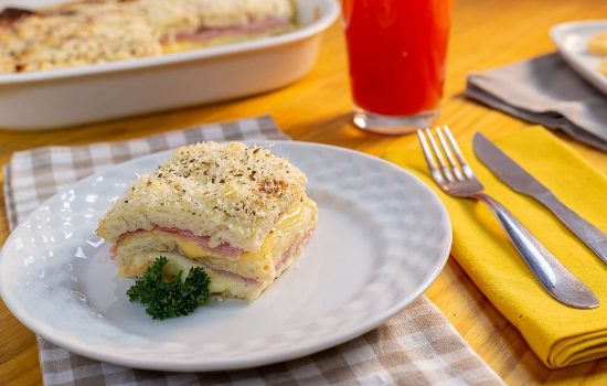 6. Coloque as fatias de queijo prato, mais uma camada de presunto, pão de forma e creme de requeijão.
