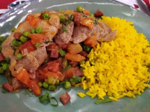 8. Salpique cebolinha verde picada a gosto e sirva com arroz de açafrão e páprica picante.