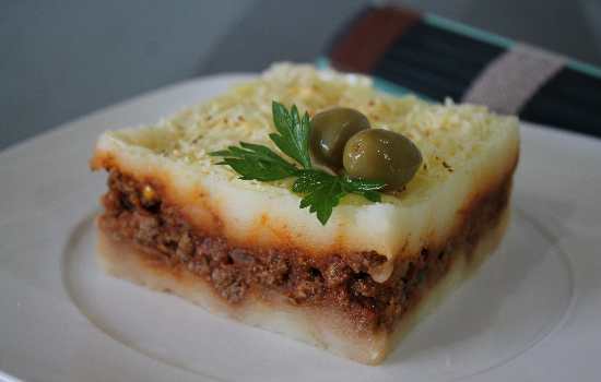 - Em uma travessa, coloque uma fina camada de purê de batata, adicione a carne e cubra com o purê.