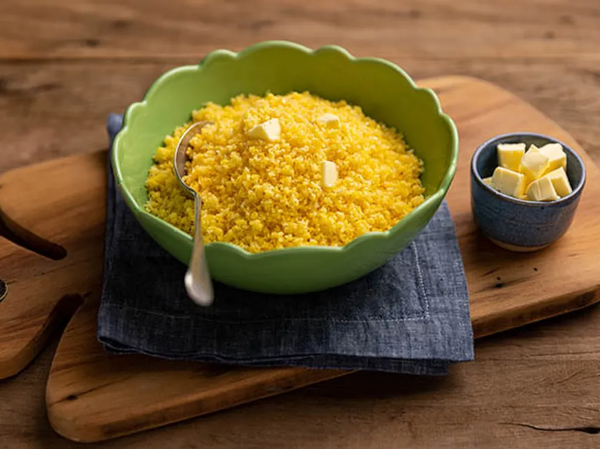 6 Regue o cuscuz com a água com manteiga e misture com o garfo — a água com manteiga vai deixar o cuscuz mais úmido e saboroso. Sirva a seguir.